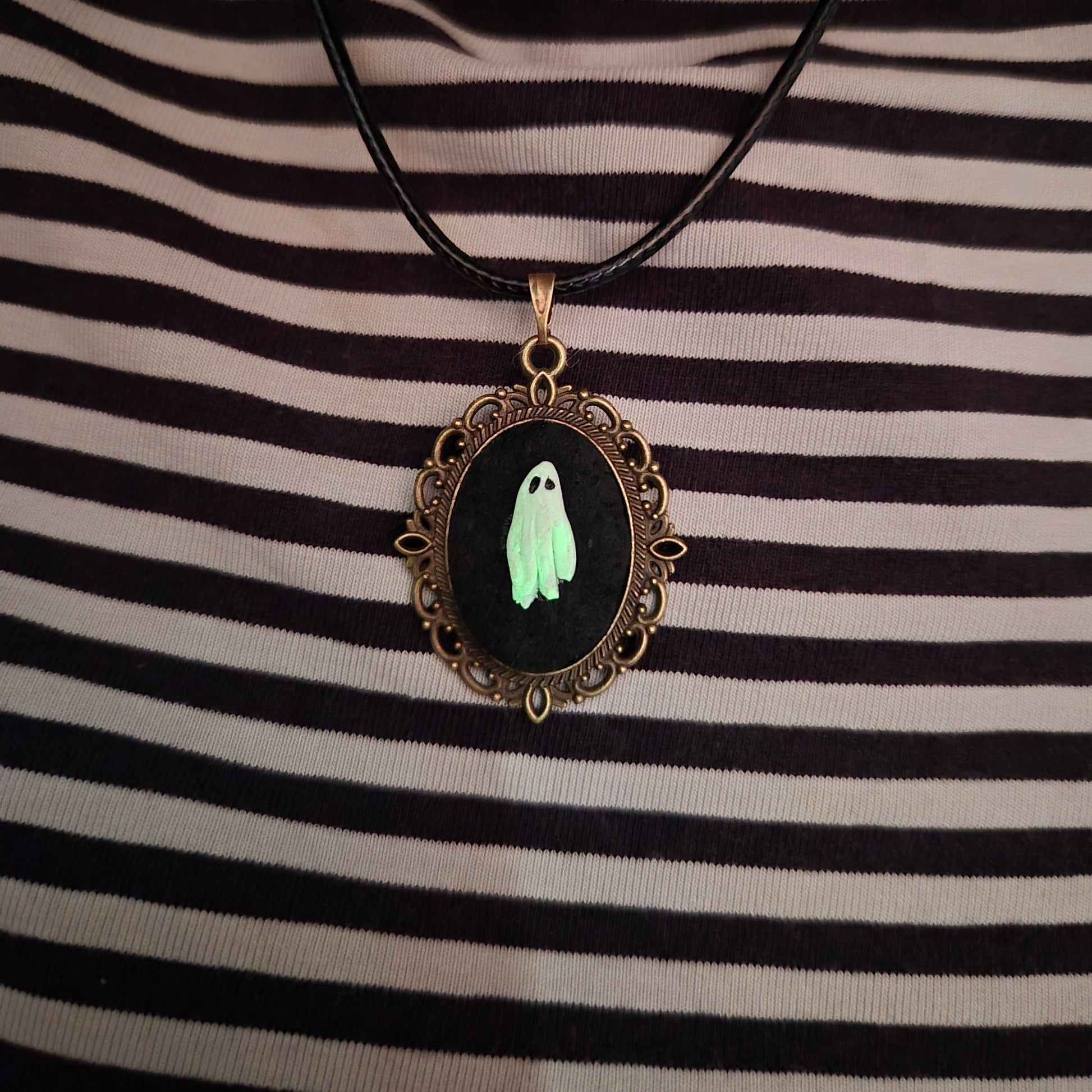 Handcrafted miniature polymer clay glow-in-the-dark ghost set within an ornate antique-style metal oval pendant.