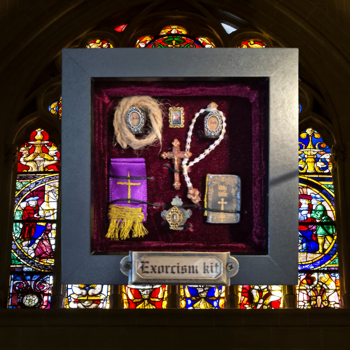 This spine-chilling piece features all the essentials a ghost hunter or demonologist might need – tiny holy water bottles, a miniature crucifix, mini bible, stole, mini salt and iron and rosary beads all aged to perfection for an authentically haunted look. 👻